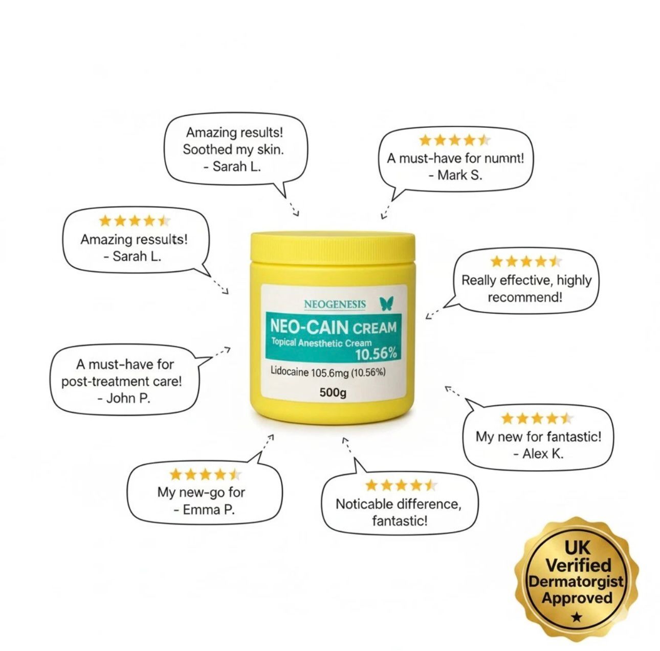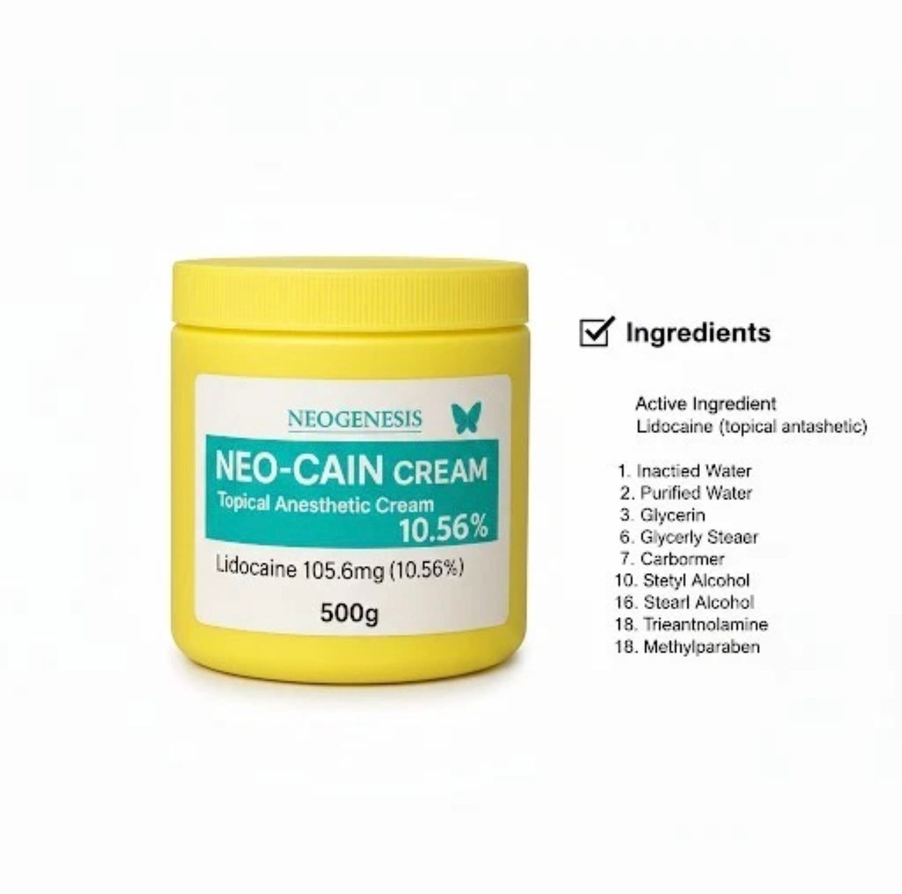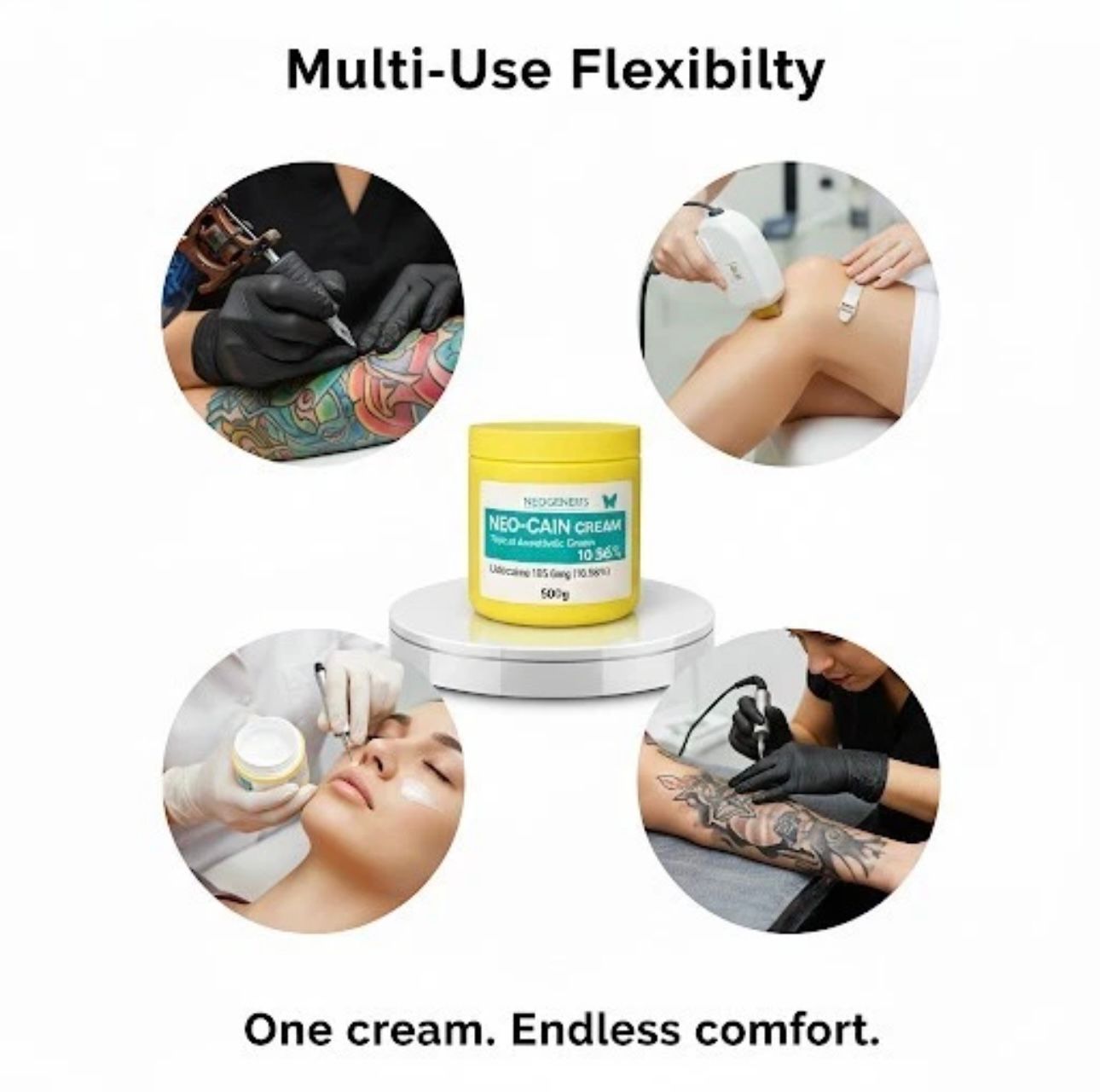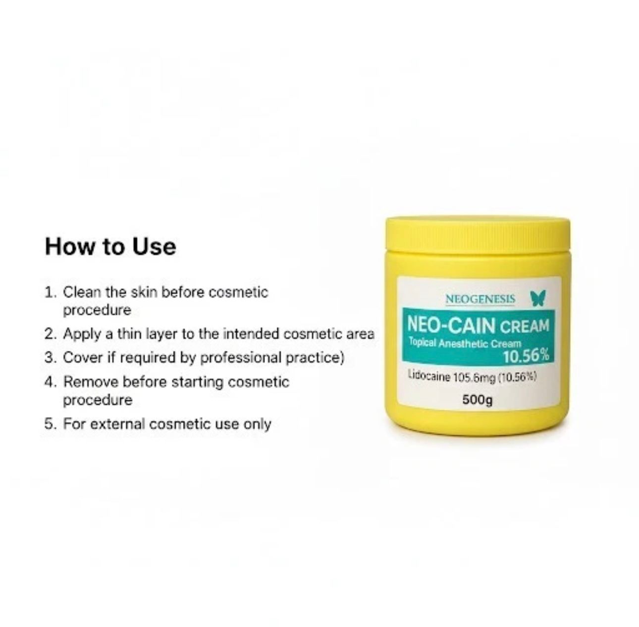 Neo-Cain Cream 10.56% is a topical anaesthetic that helps reduce pain and discomfort during and after cosmetic procedures. It works by numbing the skin and lowering sensitivity in the treated area.
